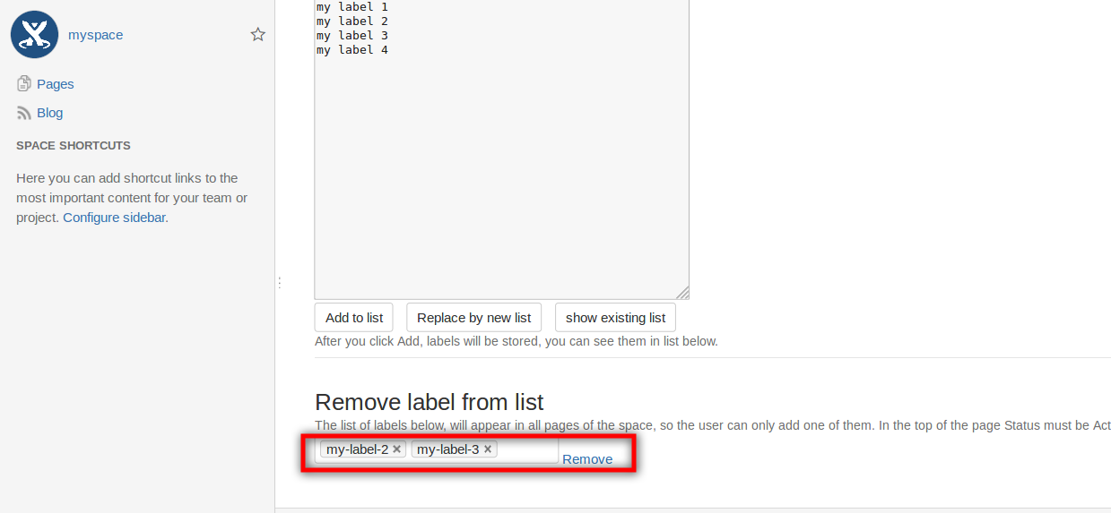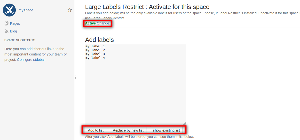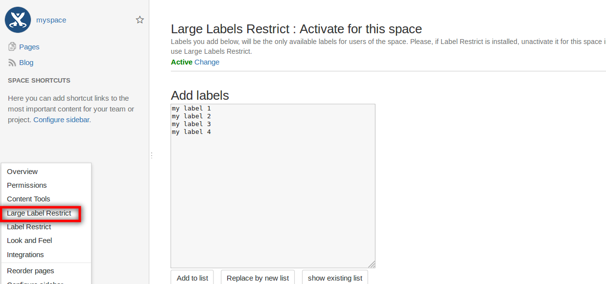 Click on 'Change' to activate the plugin for this space. Please Note that if 'Label restrict' plugin is installed, it must be unactivated for this space. Now, add labels in first textbox, you can add hundreds of them. Or click 'Replace by new list' if you want to remove old stored list, and replace it by the new one.